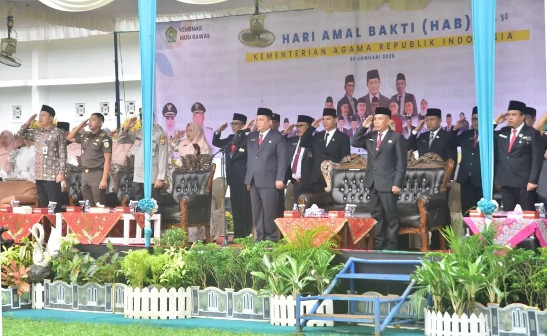 Bupati Musi Rawas Hj. Ratna Machmud diwakili Asisten Pemerintahan dan Kesra Agus Susanto menghadiri Upacara Hari Amal Bhakti (HAB) ke-80 Kementerian Agama Republik Indonesia Tahun 2026. Dalam Upacara tersebut, Agus Susanto menjadi pembina Upacara dan membacakan sambutan Menteri Agama.